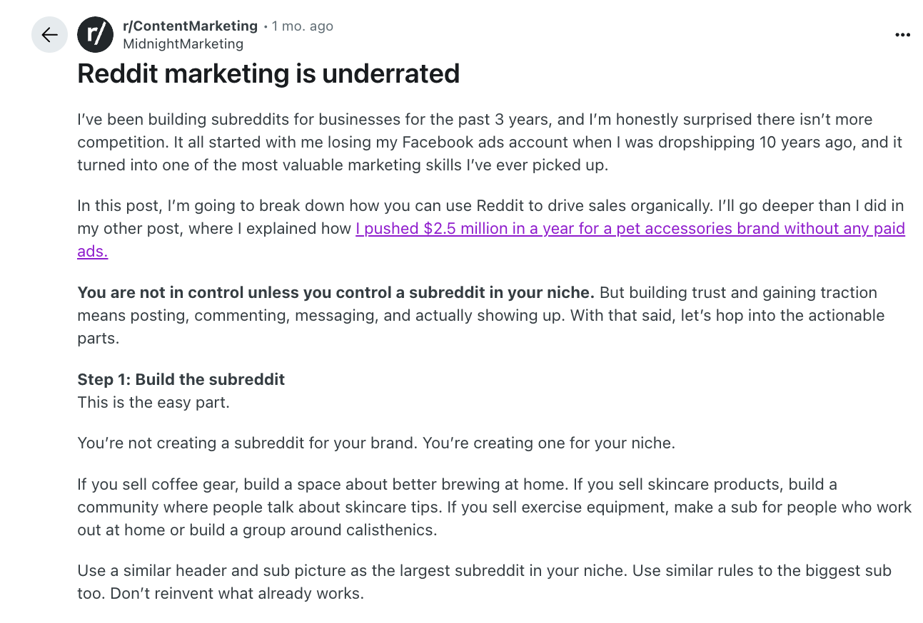 The author behind it has been building subreddits for brands for 3 years. What started as a backup plan after losing his Facebook Ads account turned into one of the most valuable marketing skills he’s ever picked up.