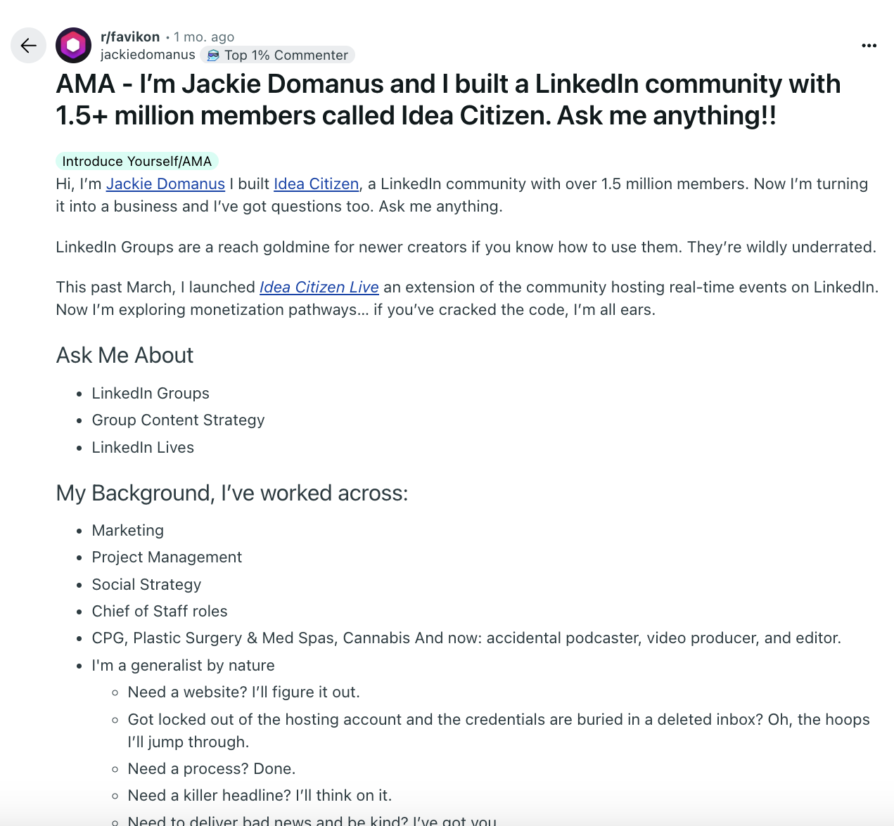 For instance, she and Jackie Domanus hosted an Ask Me Anything on subreddit “r/favikon” and shared it on LinkedIn.