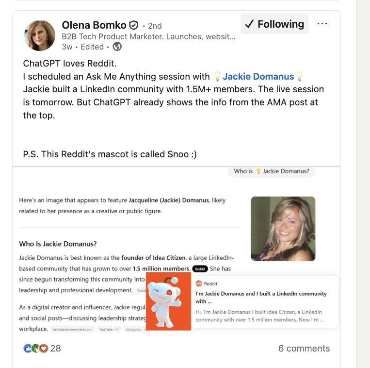 And if you want to “build a bridge” between LinkedIn and Reddit, check out how Olena Bomko does it.
