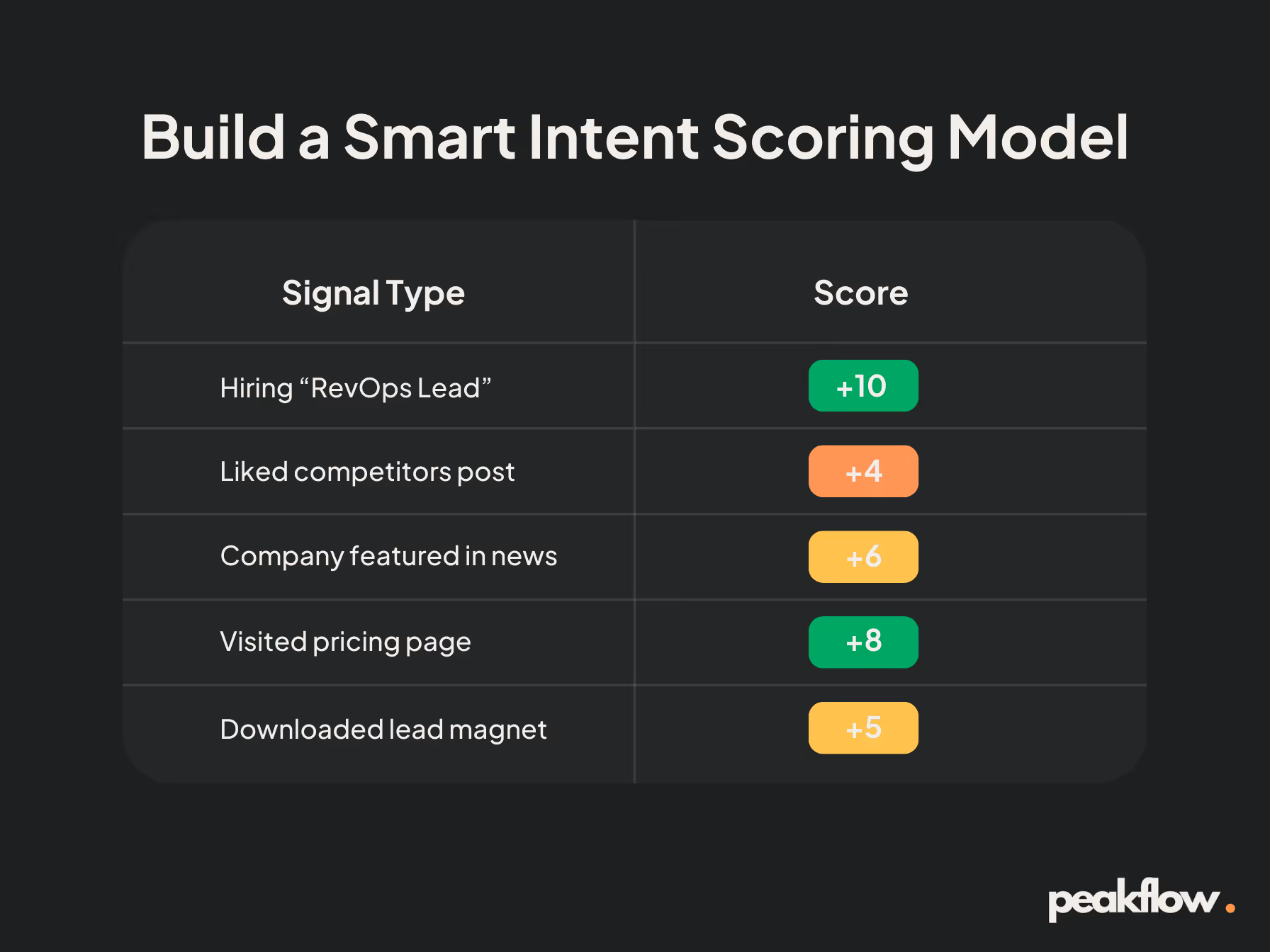 Now you have three aligned signals – a strong case for outreach. In Clay, you can track 10+ signals and assign custom scores. Once a company reaches your threshold, your team gets alerted.