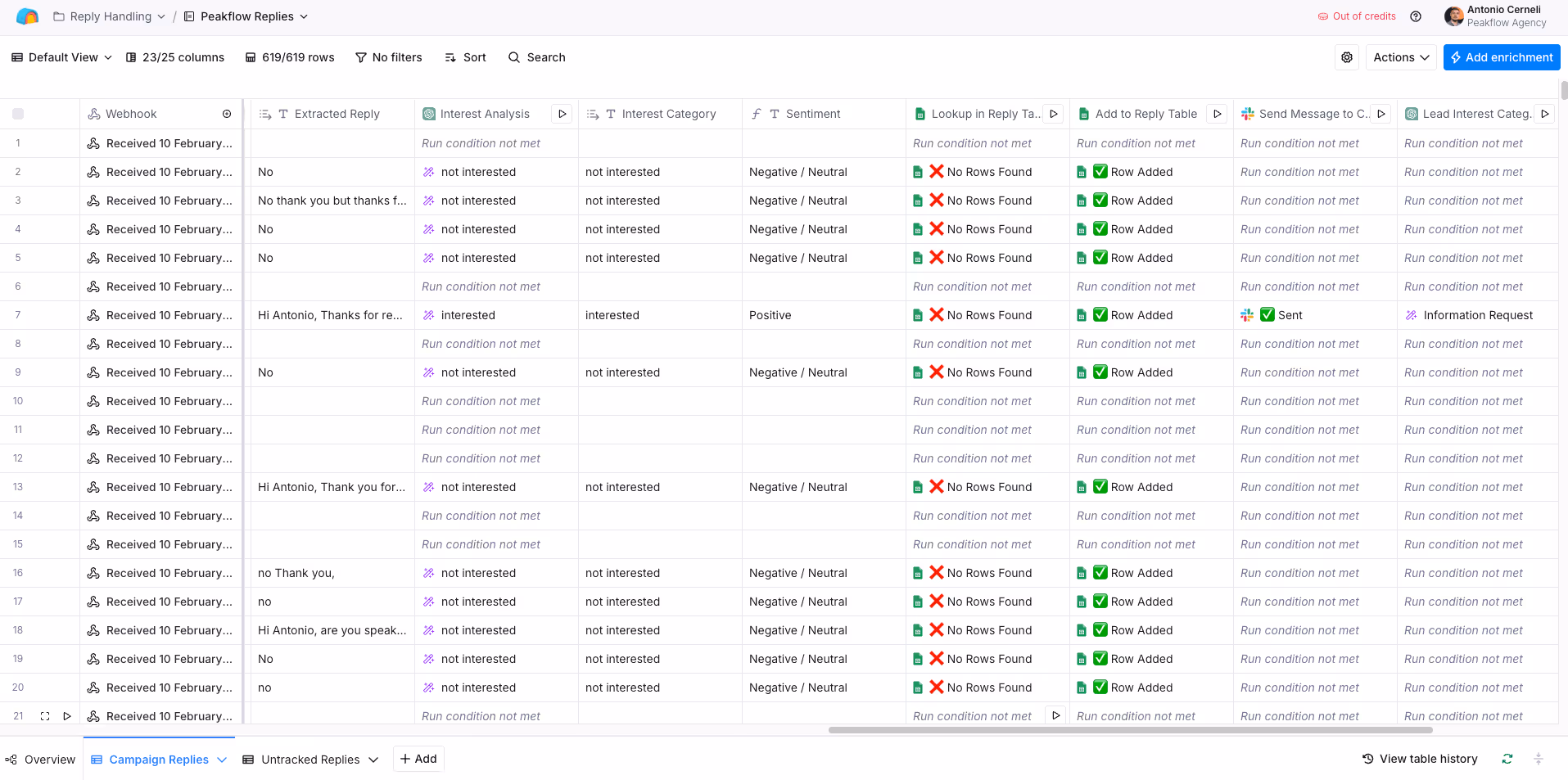 At Peakflow, we also use Clay workflows to automatically analyze email replies with AI, track sentiment, and flag warm leads for priority follow-up.